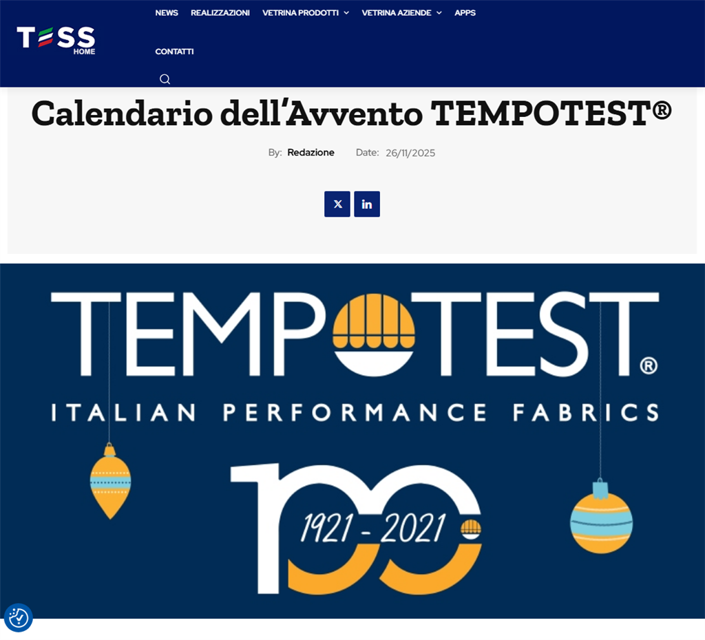 Sul sito web di Tende e Schermature Solari si parla del Calendario dell'Avvento TEMPOTEST®. Un’iniziativa nata nel 2019 e che ha sempre riscosso grande successo tra il pubblico che da anni segue molto attentamente i contenuti social delle pagine TEMPOTEST®.