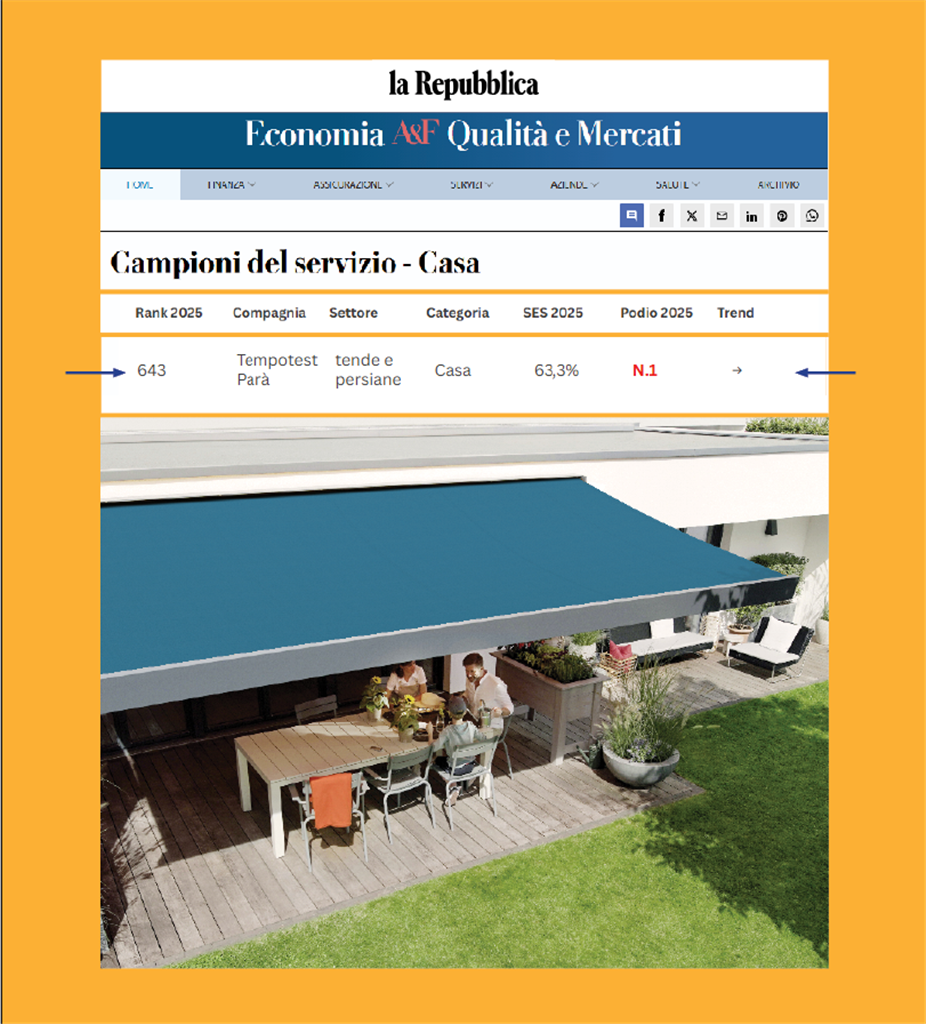 La Repubblica - Affari & Finanza, ci ha decretato “Campioni del Servizio 2026” nella categoria tende e persiane!