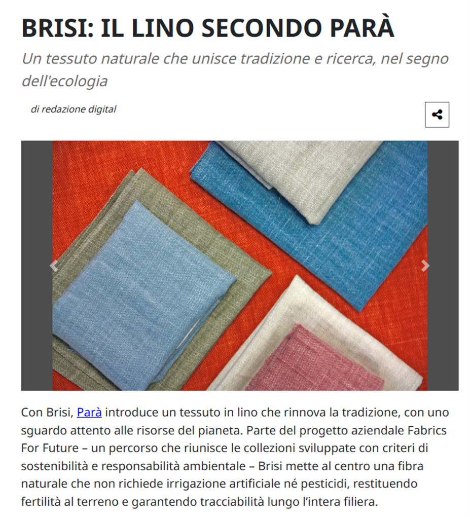 Con Brisi, Parà introduce un tessuto in lino che rinnova la tradizione, con uno sguardo attento alle risorse del pianeta. Parte del progetto aziendale Fabrics For Future – un percorso che riunisce le collezioni sviluppate con criteri di sostenibilità e responsabilità ambientale – Brisi mette al centro una fibra naturale che non richiede irrigazione artificiale né pesticidi, restituendo fertilità al terreno e garantendo tracciabilità lungo l’intera filiera.