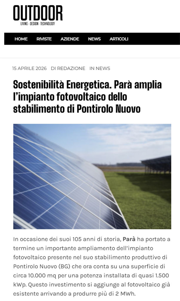 OUTDOOR parla del nostro nuovo impianto fotovoltaico