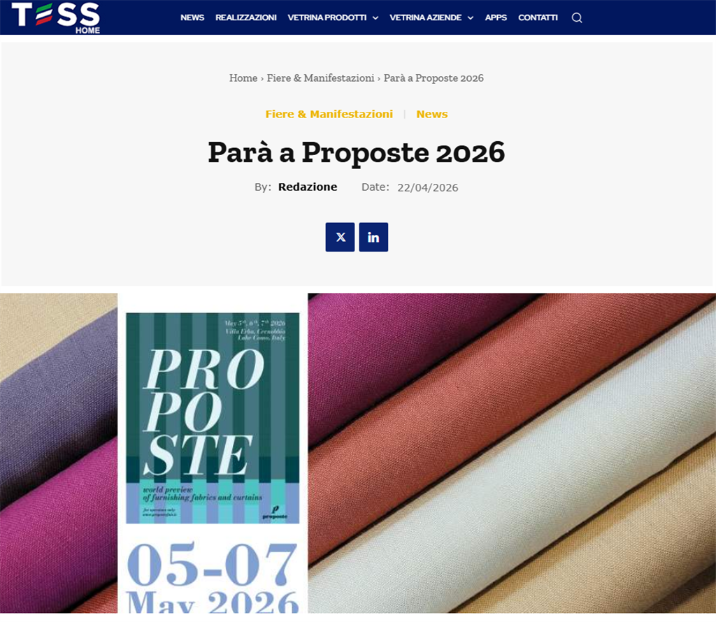 Dal 5 al 7 Maggio, nella splendida cornice di Villa Erba a Cernobbio, prenderà il via la trentatreesima edizione della Fiera di Proposte. Come sempre, Parà sarà presente con la sua ampia gamma di tessuti per arredamento IN&OUTDOOR (Ala Lario – Stand 34). Vi aspettiamo tra meno di due settimane a Villa Erba – afferma Luca Bottaro, Marketing Manager di Parà – per presentarvi tutte le novità della nostra importante collezione che varia dai tessuti in fibra naturale a quelli in acrilico tinto in massa passando attraverso le stampe indoor a quelle outdoor su PET e PET riciclato certificato GRS.